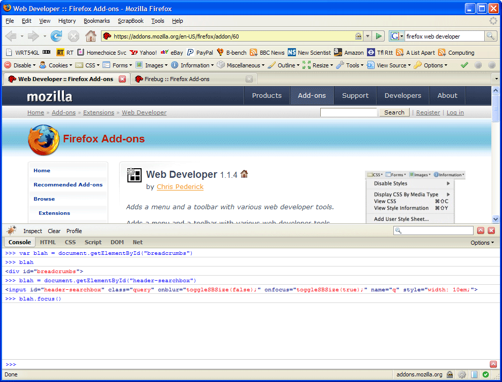 This short blog is to recommend two tools for Firefox that have proven valuable to me on those occasions when I have been doing website development – especially with CSS, but also now with JavaScript. As web-dev is not really my main role, I’m confident that I’ve only scratched the surface of what they can do.