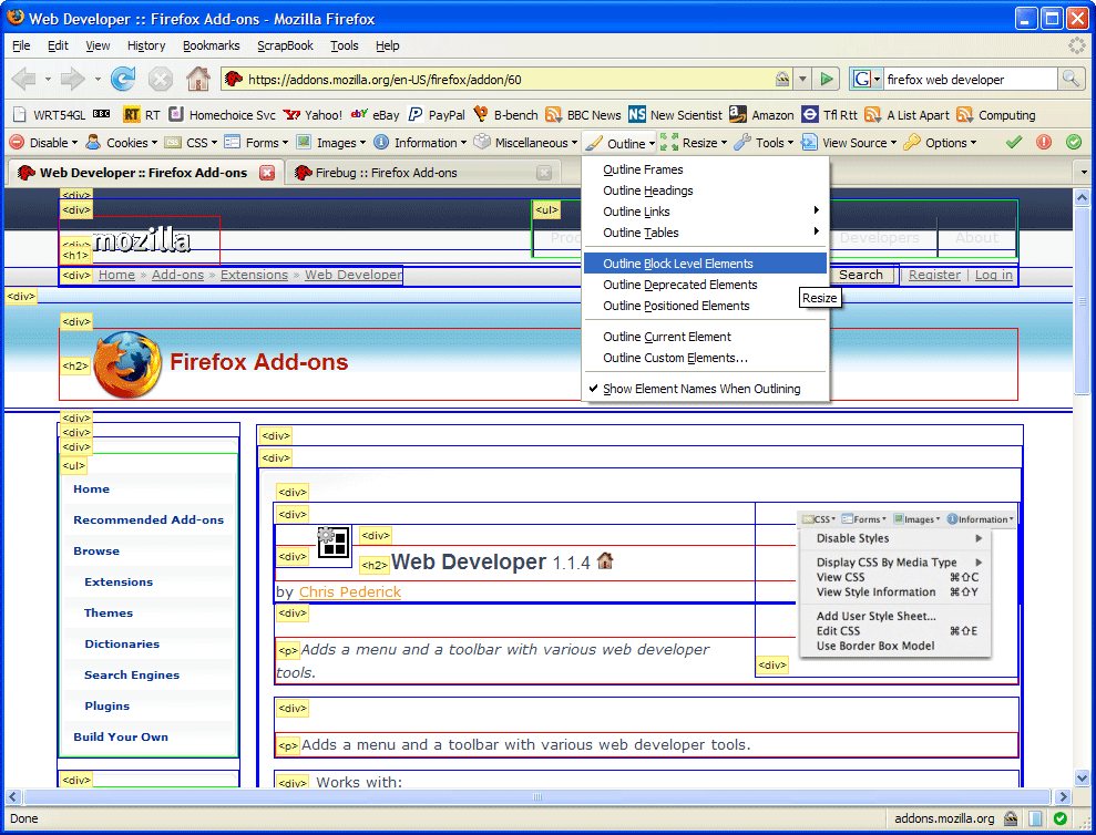 Web DeveloperThe Web Developer add-on by Chris Pederick adds a toolbar to Firefox. In particular, I’ve found the menu options that allow for outlining of certain types of elements (e.g. block-level elements, tables or table cells) very helpful, and in addition the Resize options (which resize your browser to a specified pixel dimension) is a godsend for those of use who have screens much larger than those of the intended audience. The screenshot shows Block-level elements outlined – a nice way to get a feel for the way a page is constructed.