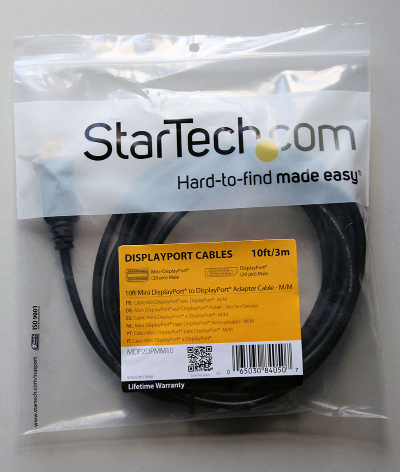 On a couple of occasions I searched for alternatives, but in general DP cables are considerably less available than HDMI, DVI or even ancient VGA cables; so I failed a couple of times; but finally in the last couple of weeks I found that Amazon hold a StarTech.com Mini DisplayPort to DisplayPort Adapter cable – I bought the 10ft (approx 3m) version.